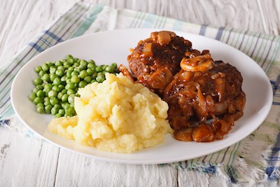 Salisbury steak is made with ground beef, often lean ground beef because for this flavorful dish you don't want an excessive amount of fat drippings.